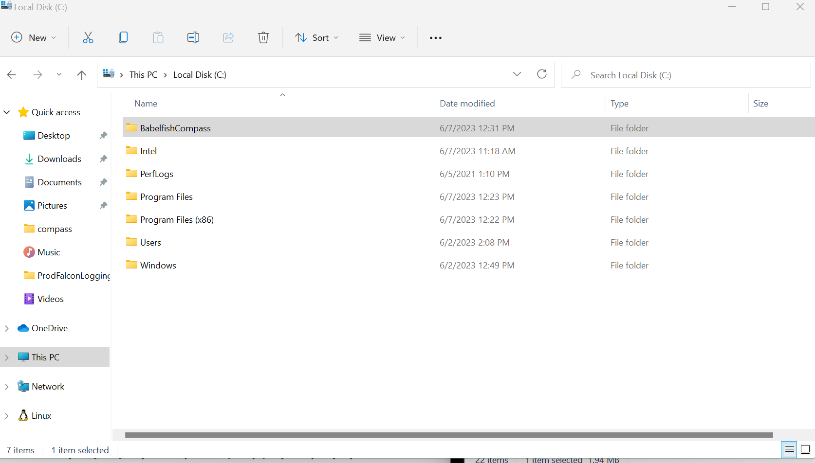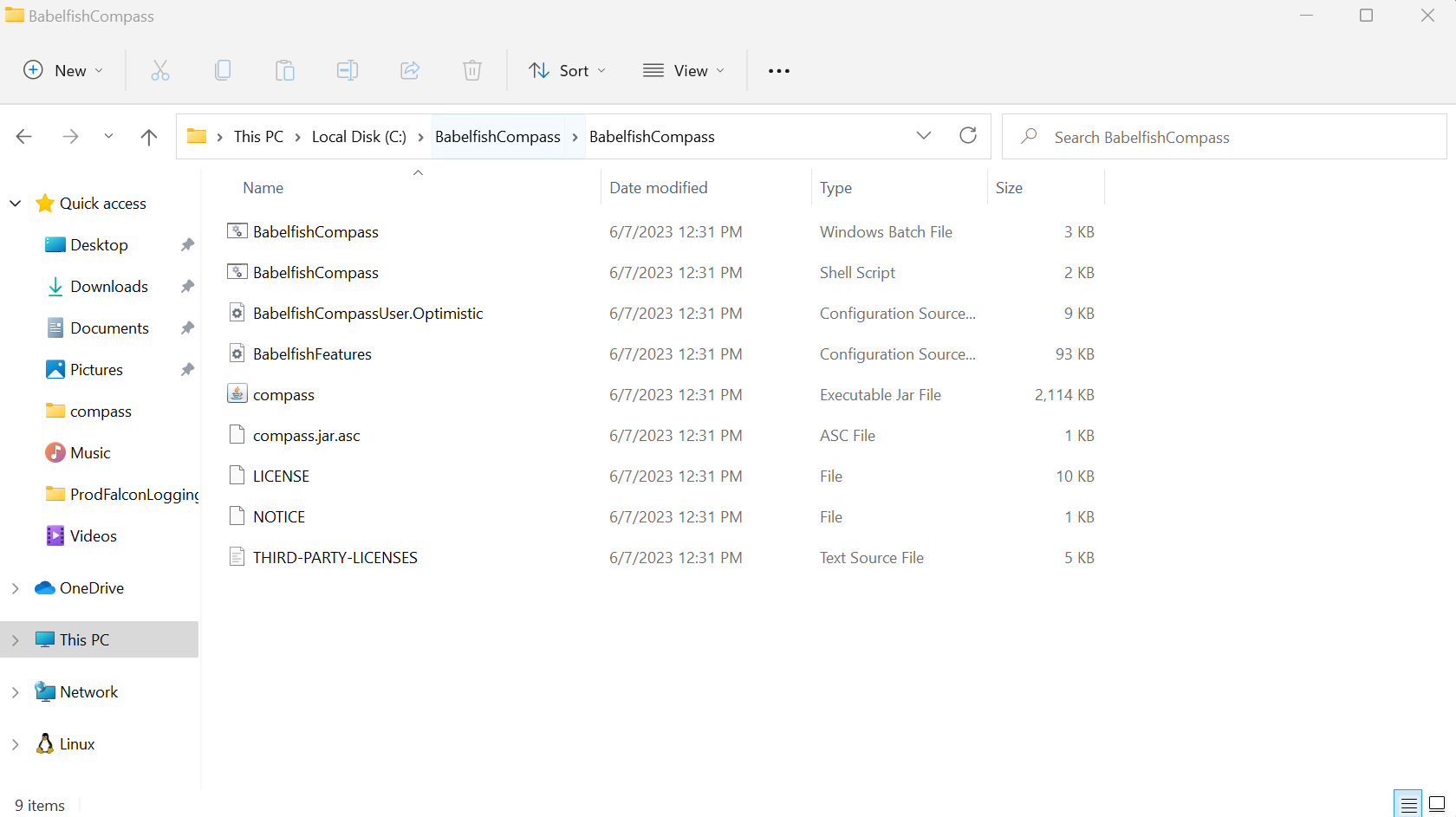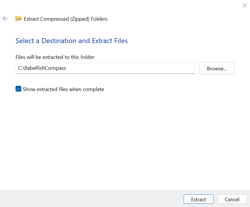 In the Windows File explorer, extract the downloaded ZIP to C:\BabelfishCompass. Here is what it looks like on my computer: