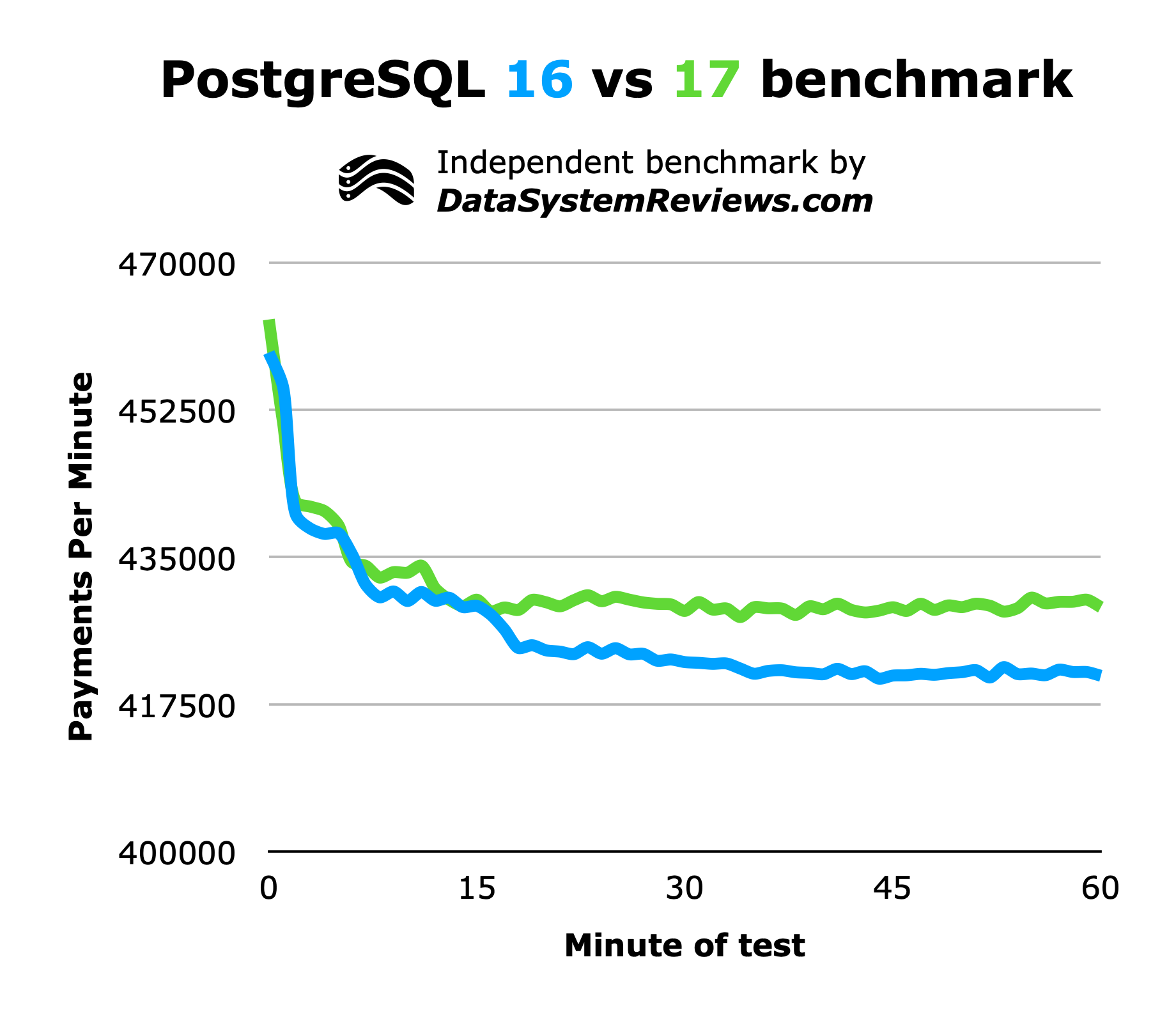 PostgreSQL 17 was a bit faster than 16 - a consistent 2% faster after the performance of both systems plateaued. Here is that same data, but visualized in a different way. I summed how many payments were made over the last 30 minutes of each test (so, after the plateau was reached) and divided that number by how many seconds are in 30 minutes