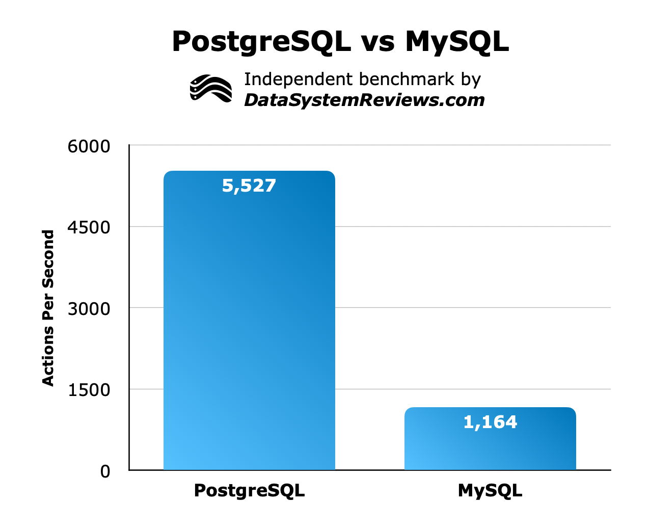 PostgreSQL left MySQL in the dust. It is actually surprising how much faster it was is than MySQL, considering that some major tech organizations like Uber have written blog posts expressing their preference for MySQL, for performance reasons.