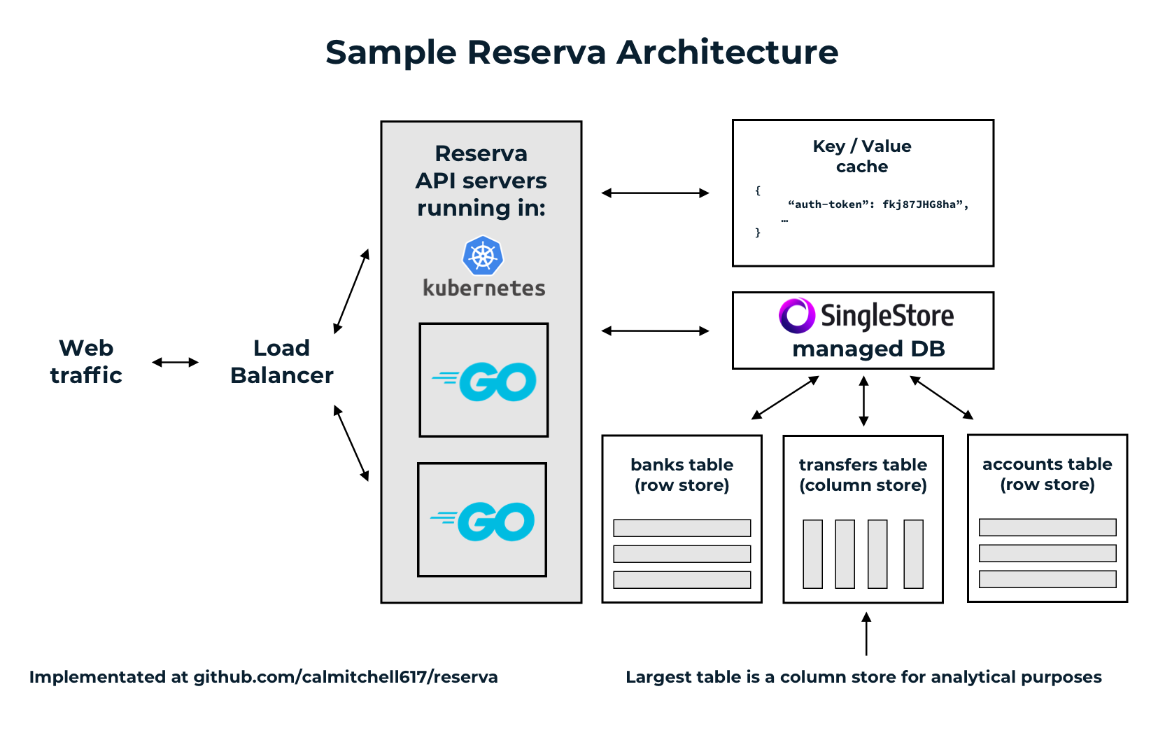 Reserva is a Go web application built on top of SingleStore and Redis. SingleStore can actually handle any in-memory caching that Redis can, but I am comfortable with a particular pattern for using Redis' key-value data model for an authentication cache, and decided to stick with it for now.