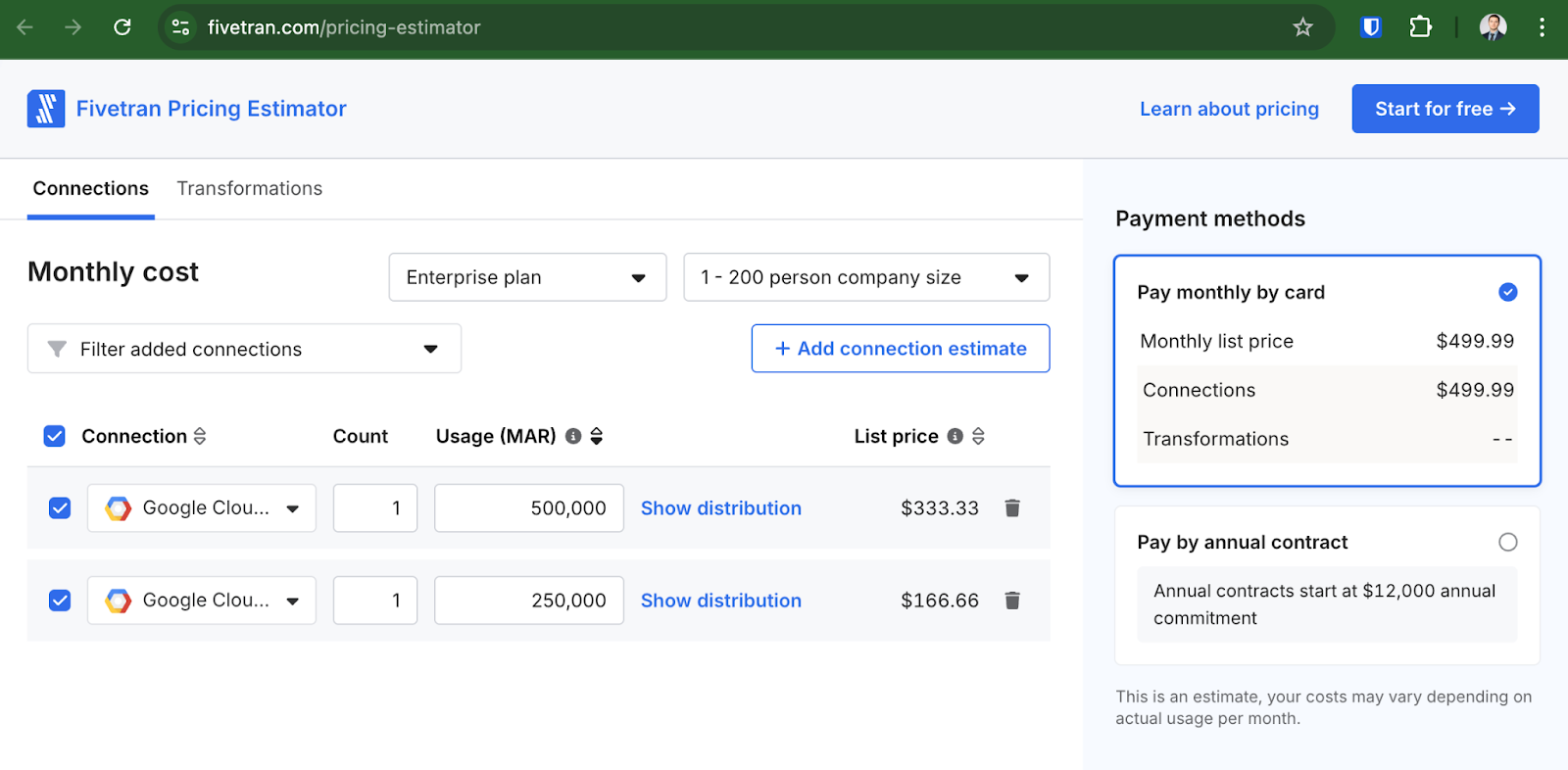 If we plug this info into the Fivetran cost calculator, with the “Enterprise” plan selected, you get roughly $500 per month: