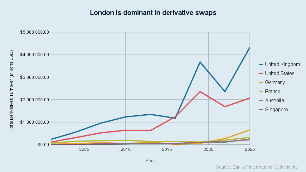 Still with me? OK. London is the most popular place to do this, with New York in second place. Especially "derivative swaps".